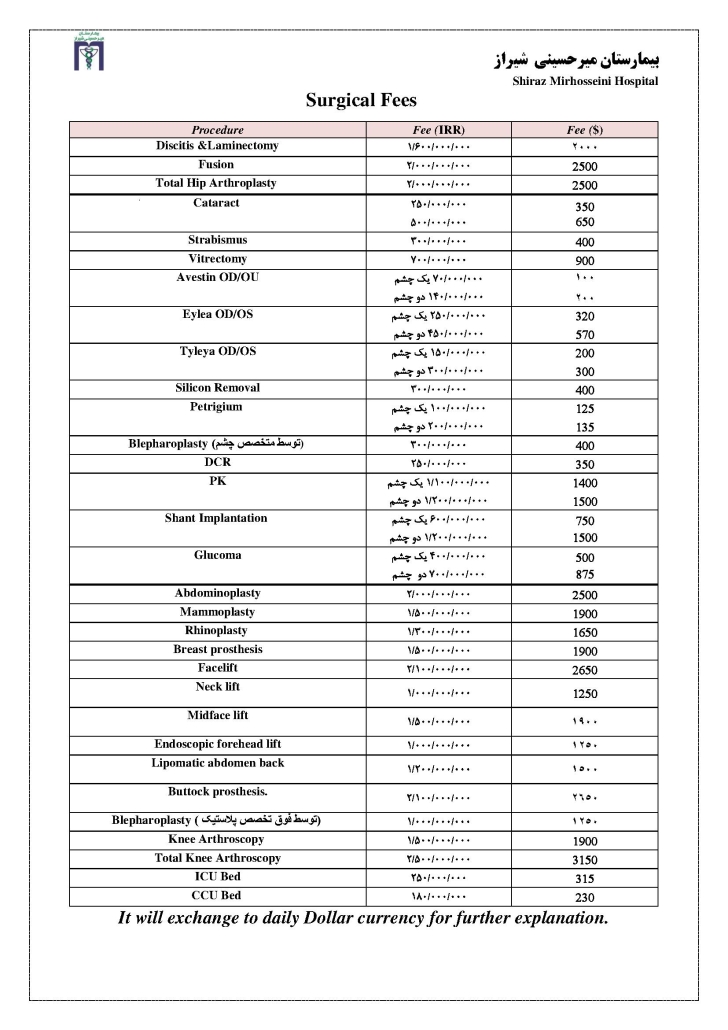 Surgical Fees2022-05-26/in Uncategorized, Uncategorized /by maral https://mirhosseinihospital.com/wp-content/uploads/2021/12/mirhosseini-logo-300x100.png 0 0 maral https://mirhosseinihospital.com/wp-content/uploads/2021/12/mirhosseini-logo-300x100.png maral2022-05-26 10:24:312025-09-27 19:34:35Surgical Fees